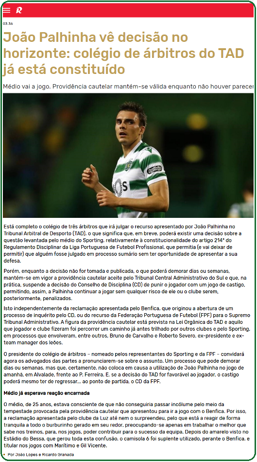 Estará finalmente formado o "colégio de três árbitros" que irá julgar o recurso apresentado por João Palhinha no Tribunal Arbitral de Desporto (TAD), o que significa que, em breve, poderá ver a luz do dia a tão esperada decisão sobre a questão levantada pelo médio do Sporting, relativamente à constitucionalidade do artigo 214º do Regulamento Disciplinar da Liga Portuguesa de Futebol Profissional que permitia (e vai necessária e obrigatoriamente deixar de permitir) que alguém fosse julgado em processo sumário, sem ter oportunidade de apresentar a sua defesa.
